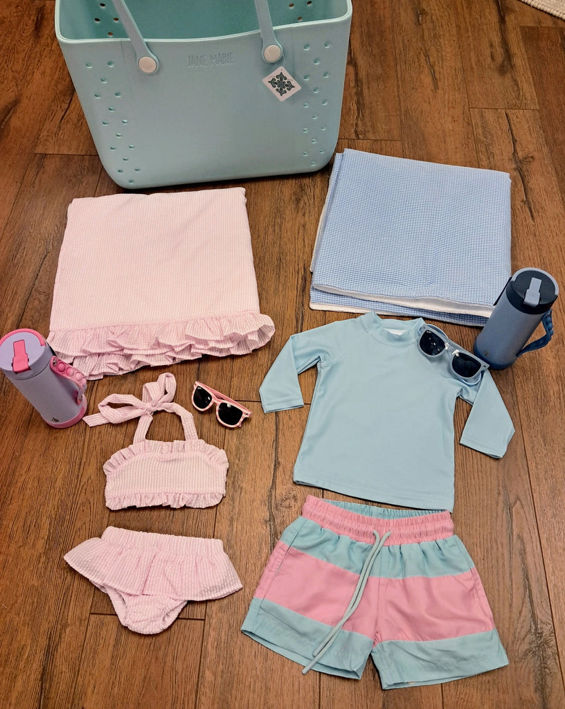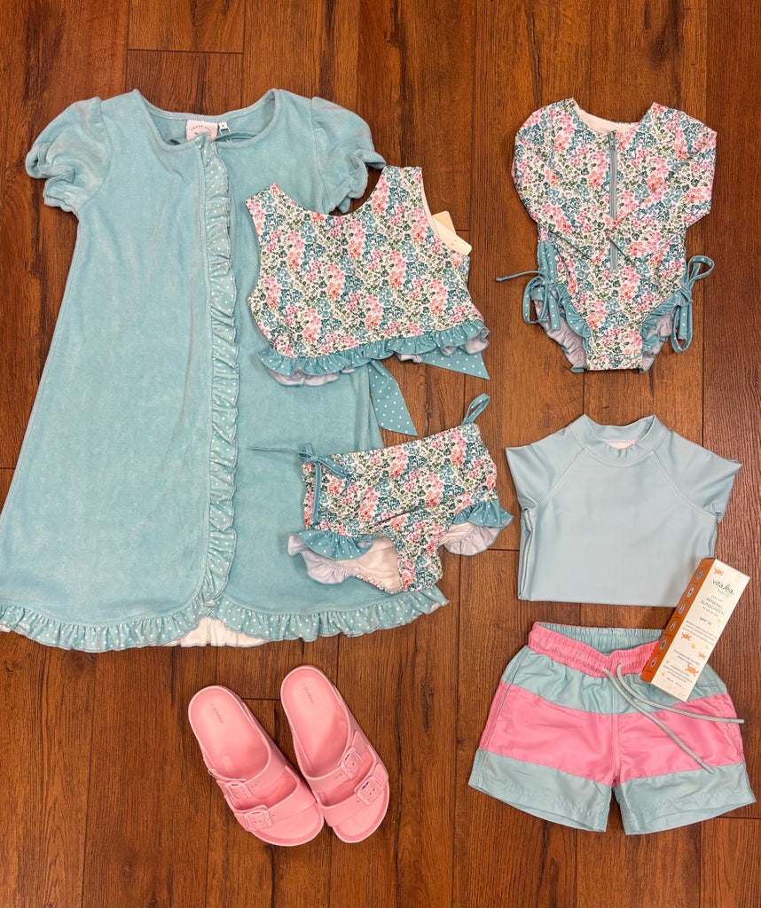 The swim trunks also match the girls rash guard & two-piece swim suit by Swoon Baby Clothing.