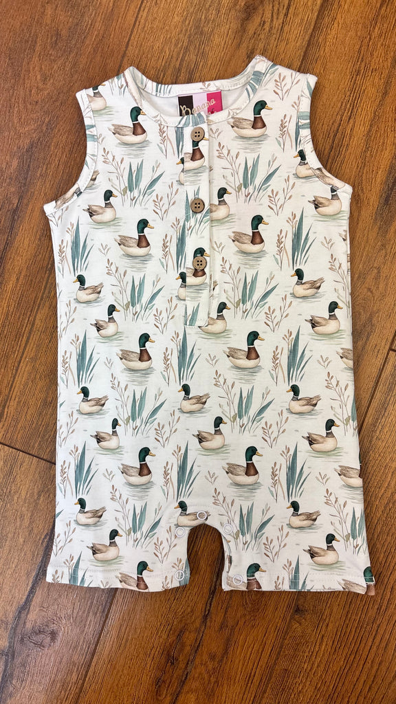 Sleeveless henley with mallard print. Snaps for easy diaper change.