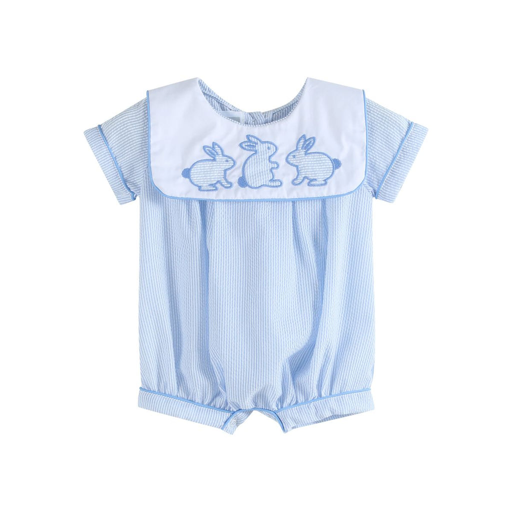 Light Blue Seersucker romper with gingham appliqued bunnies on the yoke.