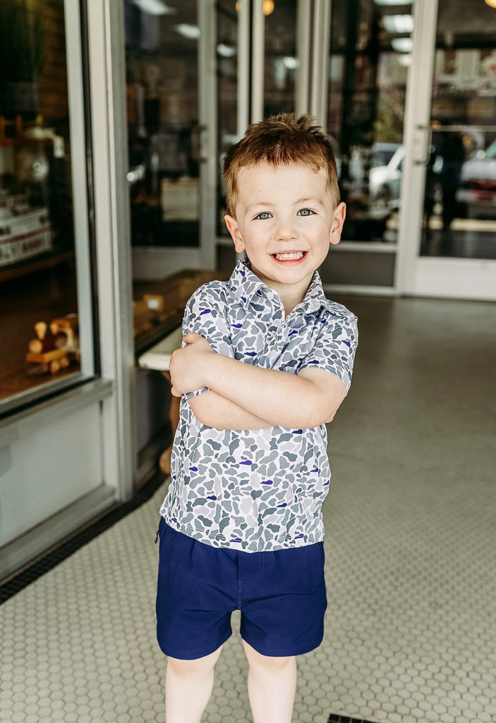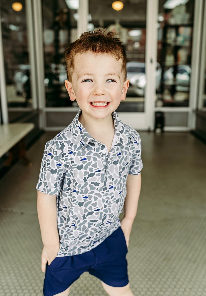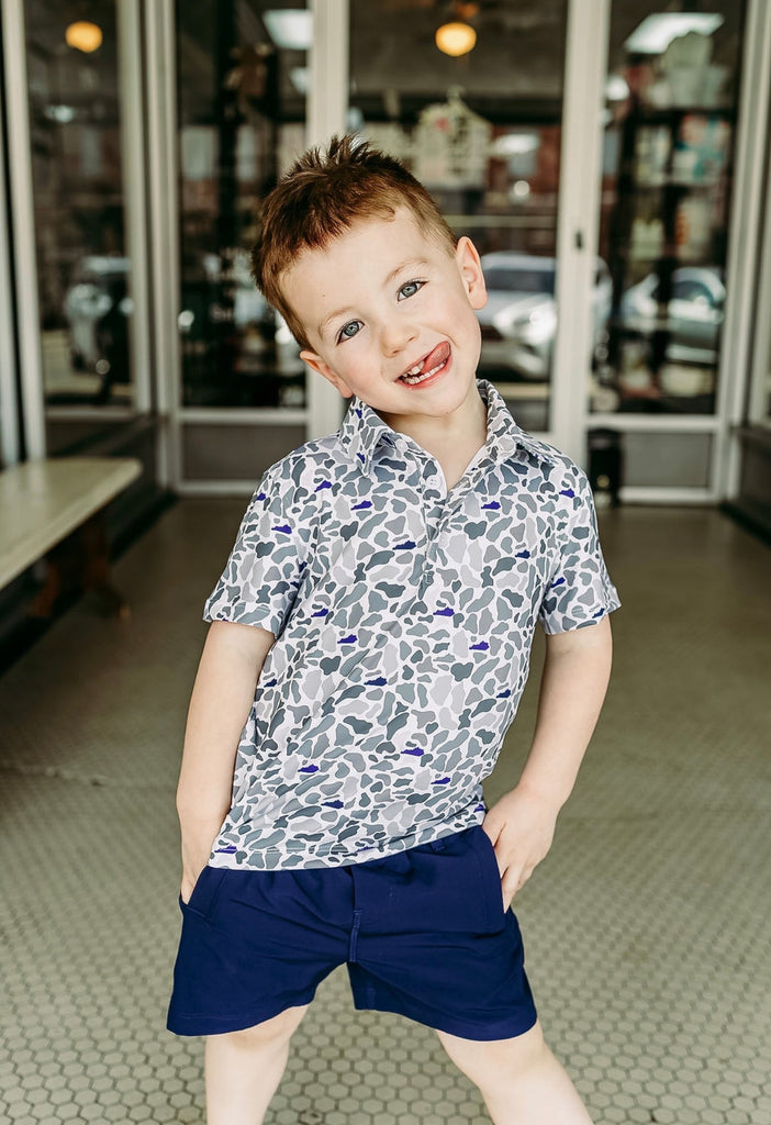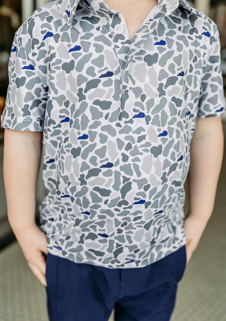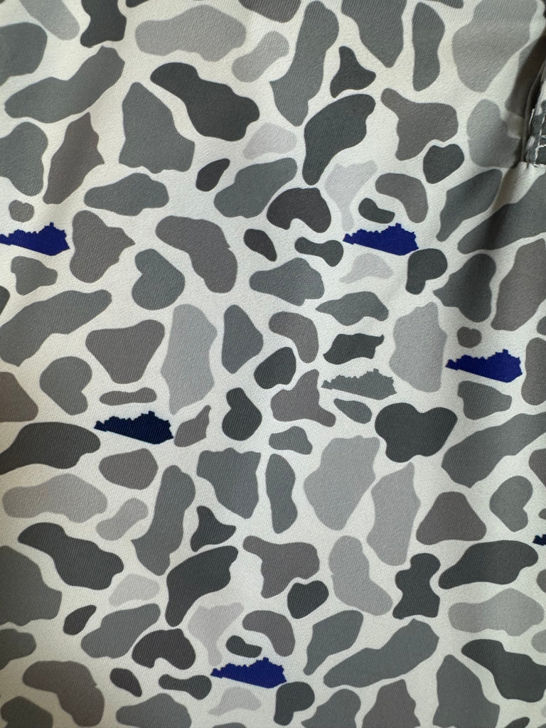 Performance polo with the state of Kentucky in the camo in UK blue and black.