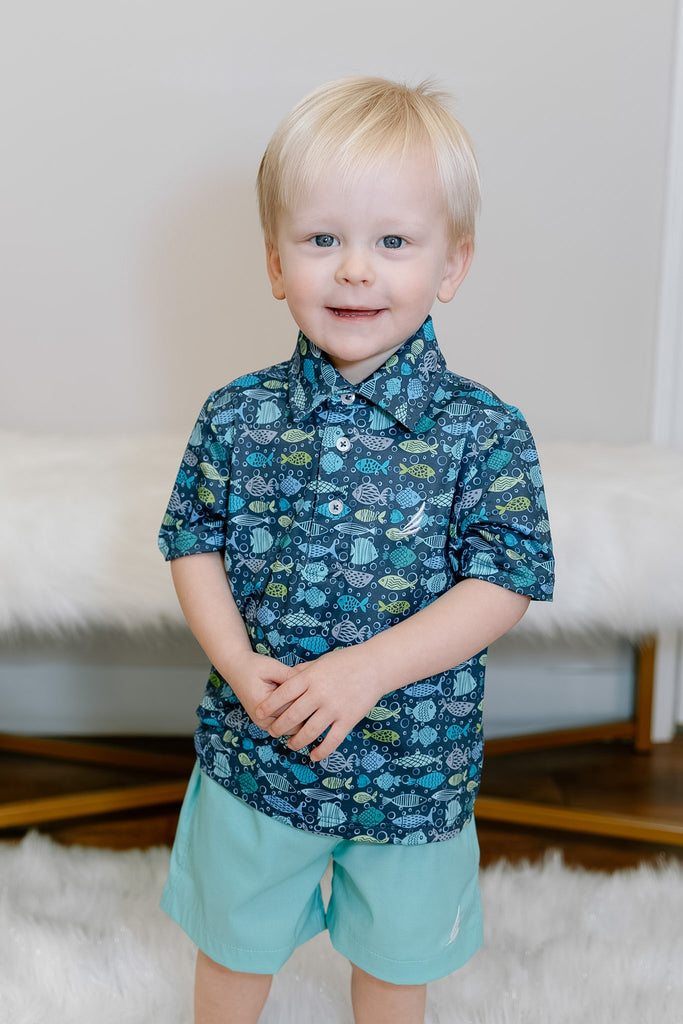 Navy background performance polo accented with light purple, lime green and light blue fish.