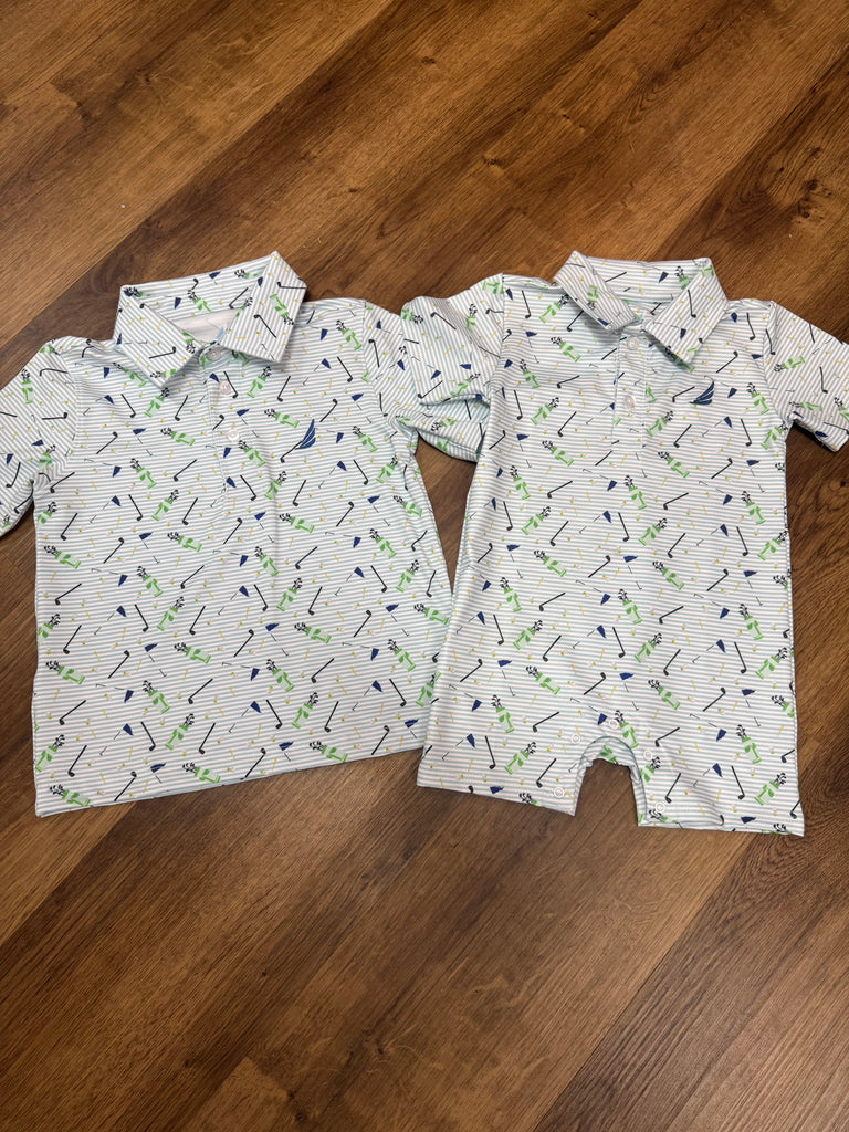 Light blue stripe performance polo material with accents of golf clubs, bag, tees, flags and golf balls in navy and green.