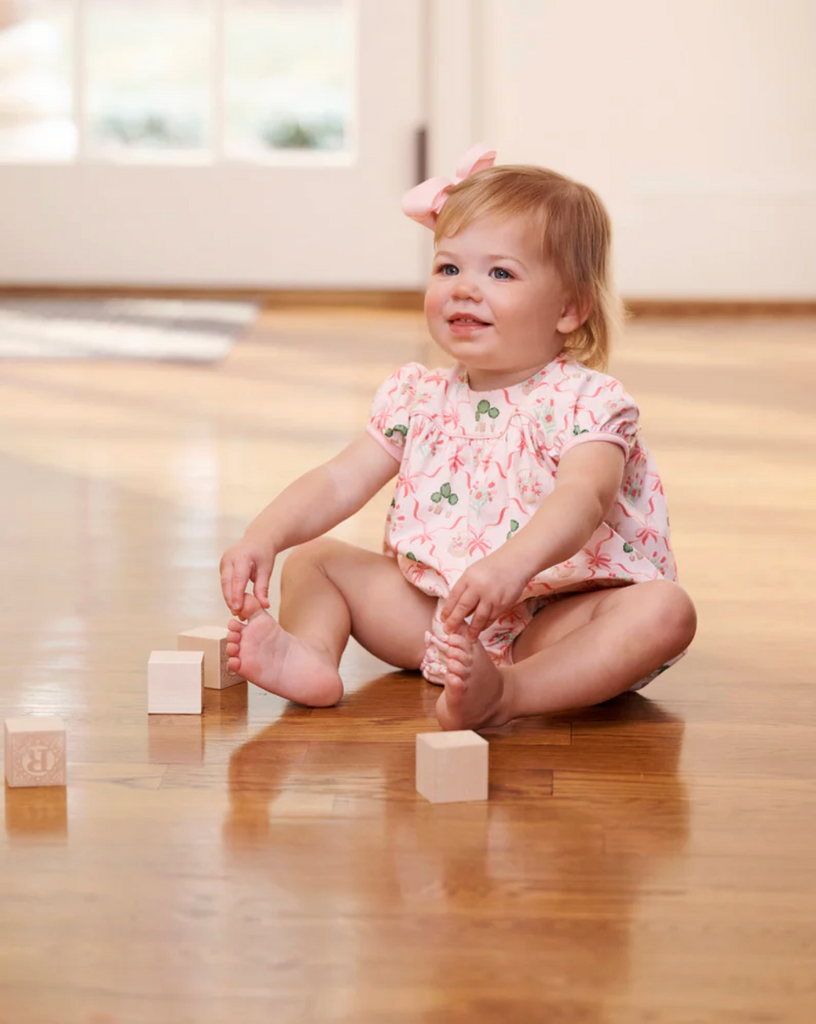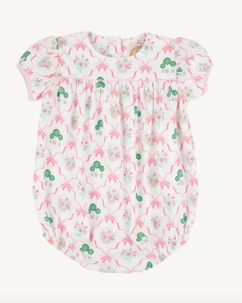 Capture hearts with our Blythe Bubble featuring the elegant Boxwoods & Bows print beautifully accented with Palm Beach Pink trim, designed with a sweet bubble silhouette perfect for your little one. Expertly crafted from premium fabric with charming details and a comfortable fit, this adorable one-piece is ideal for creating cherished memories. A timeless wardrobe favorite that brings classic elegance and effortless style to every celebration.