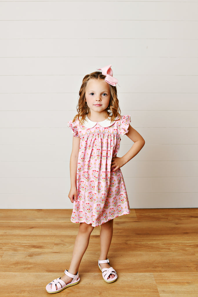 A pink dress with an artistic floral design, peter pan collar with pink crocheted lace, and cap sleeves.
