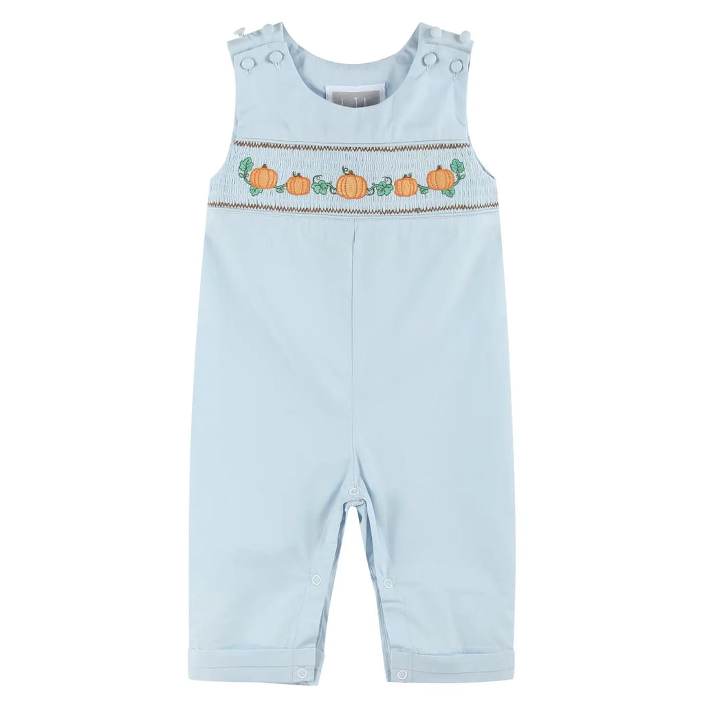 Celebrate the season with our Blue Pumpkin Overalls for your sweet guy! With delightful smocking at the chest and charmingly embroidered pumpkins, these overalls bring a touch of autumnal joy to your child's wardrobe. Adjustable buttons at the shoulder for a snug fit and snaps at the crotch ensure diaper changes are a breeze. Perfect for festive gatherings and pumpkin-picking adventures, let your little guy embrace the fall spirit in style.