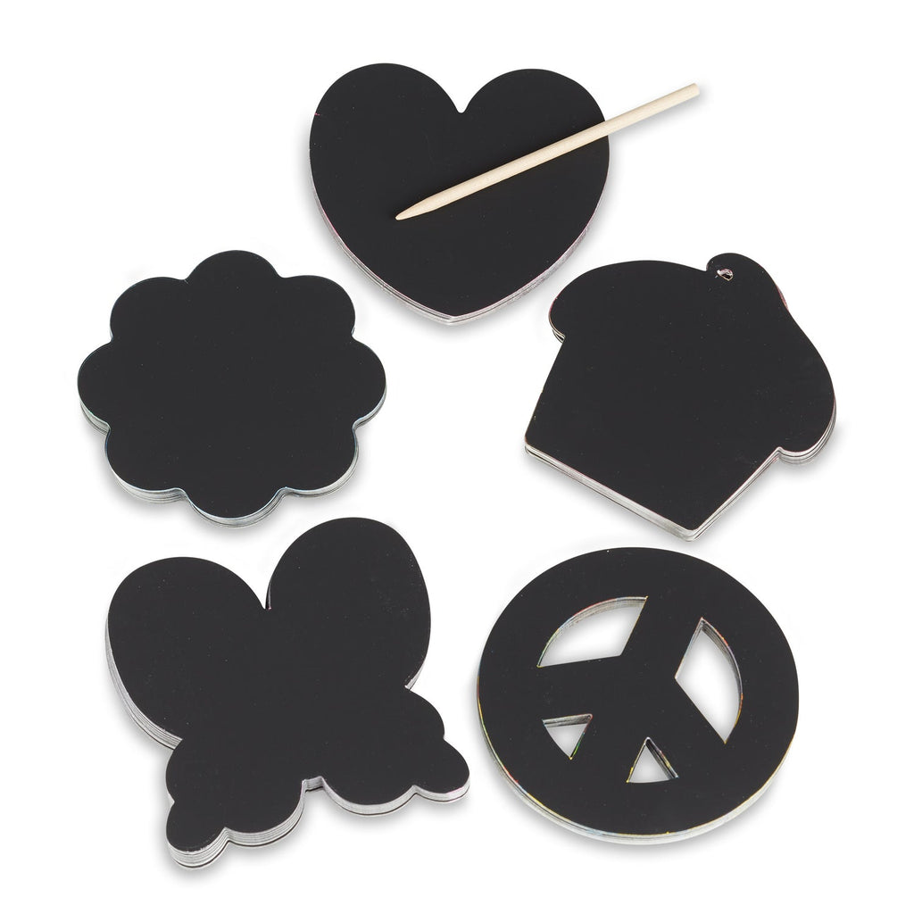 Simple to use, amazing results, and surprises revealed with every scratch, Scratch Art® Nature Notes are a unique way to create messages, designs, gift tags, and more! Scratch away at the black coating to reveal five different colorful patterns. Each box contains 125 notes (approximately 3.5 inches by 3.5 inches) in five friendship/favorite things-themed shapes (flower, heart, peace sign, cupcake, and butterfly). Kids four and older can use the wooden stylus to add designs, doodles, patterns, words, pictures and more to create truly one-of-a-kind works of art! Notes and stylus store in a handy desktop dispenser box.