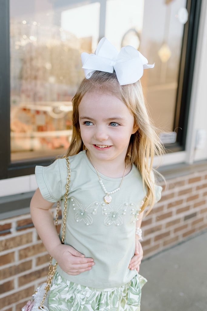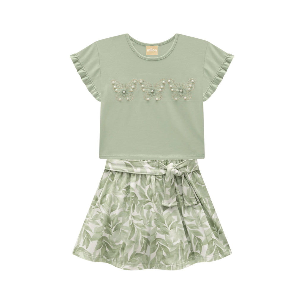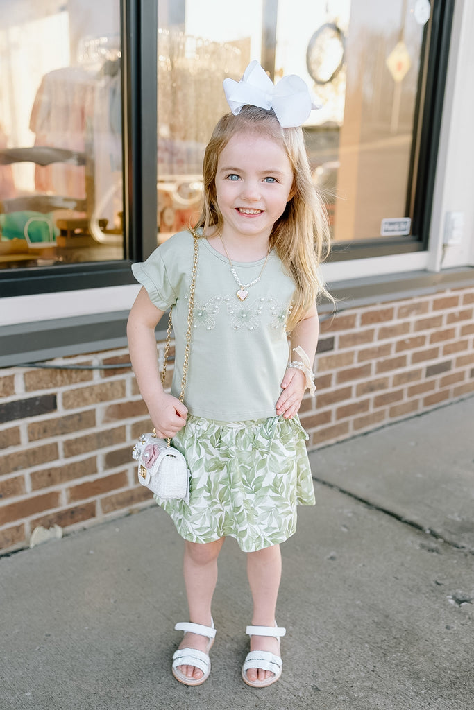 Sage green cap sleeve top accented with gold butterflies and pearls. Skort is a sage leaf pattern accented with a tie at the waist.