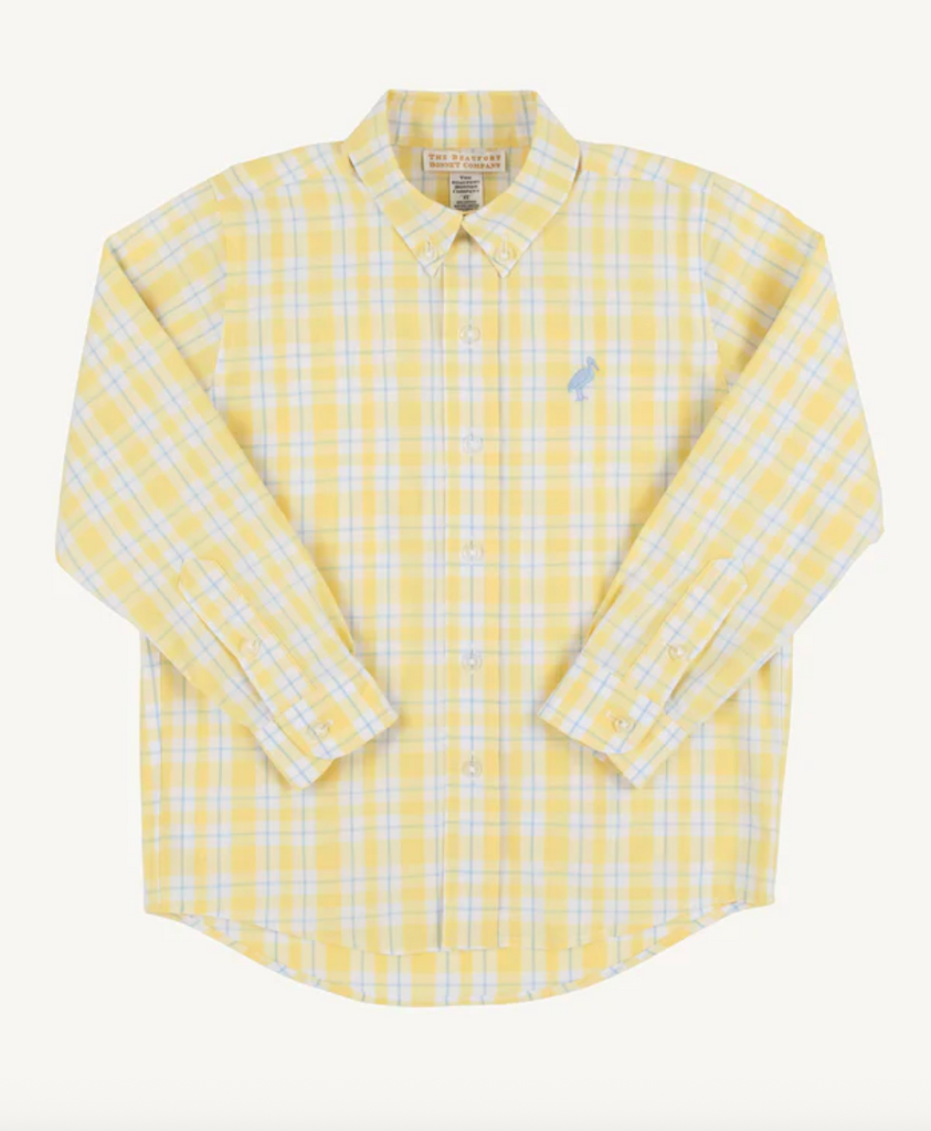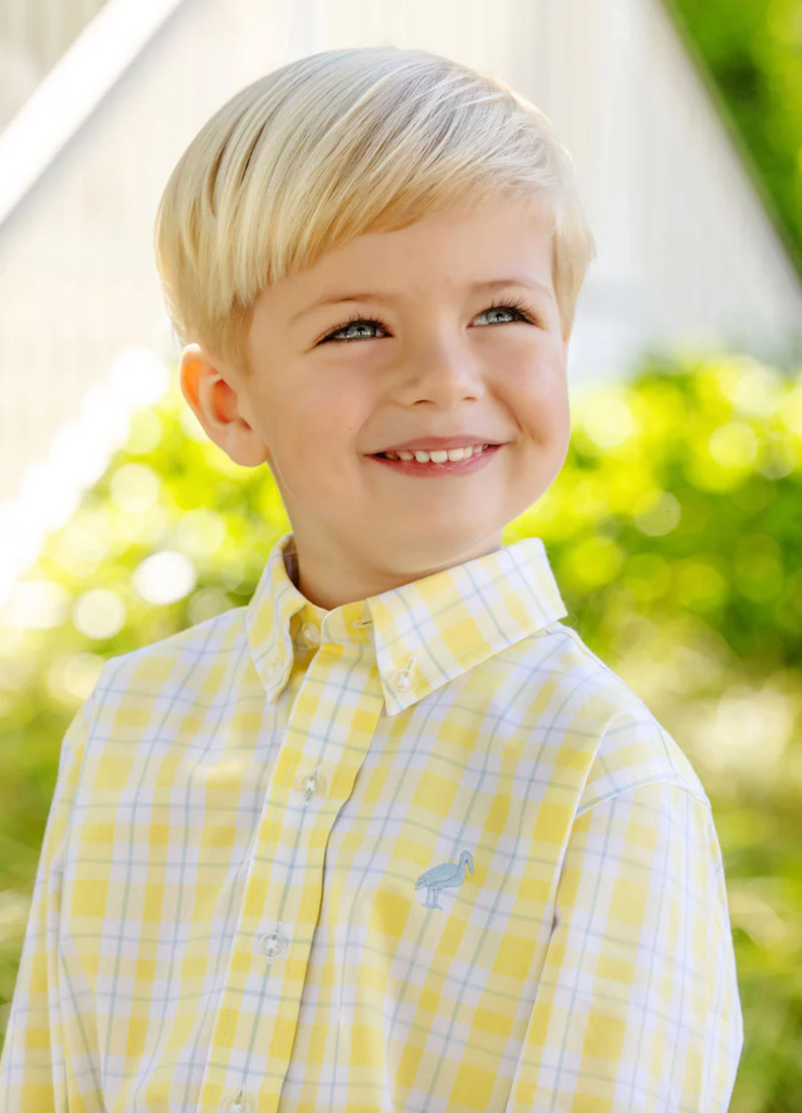 Brighten up your little gentleman's wardrobe with the Dean's List Dress Shirt in Forsyth Park Plaid with Beale Street Blue Stork! This spirited shirt brings together a cheerful plaid pattern and our beloved stork embroidery, creating a look that's both polished and playful for Easter brunches, spring weddings and every joyful celebration. Crafted with premium fabric that keeps him feeling fantastic all day long, this is the shirt that brings smiles to every special occasion!