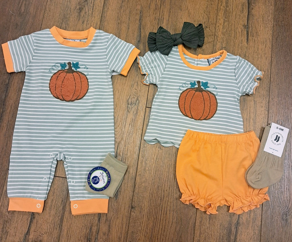 Teal striped romper with orange trim and an appliqued pumpkin.