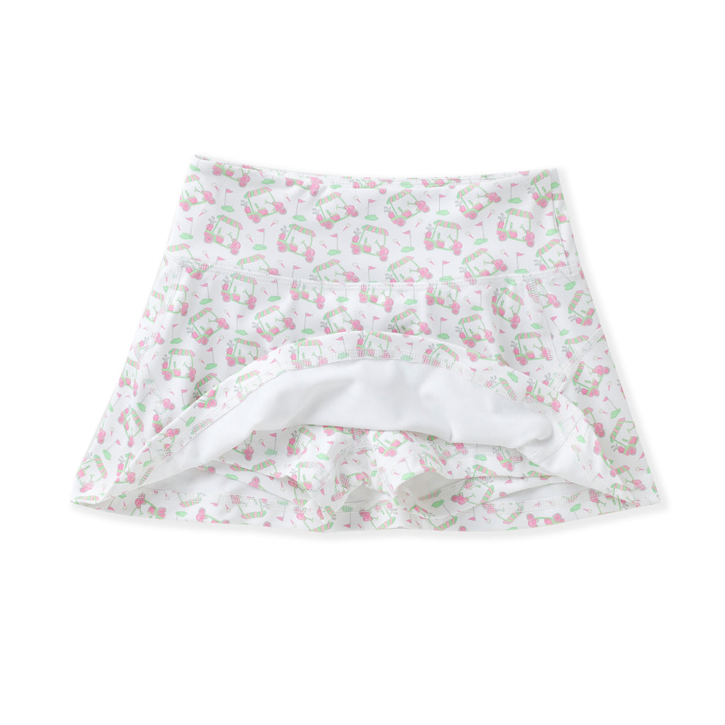 Cute skort in a pink and green golf cart print.  Matches perfectly with our green and pink tank.