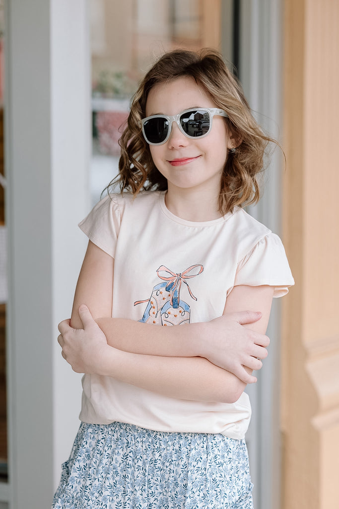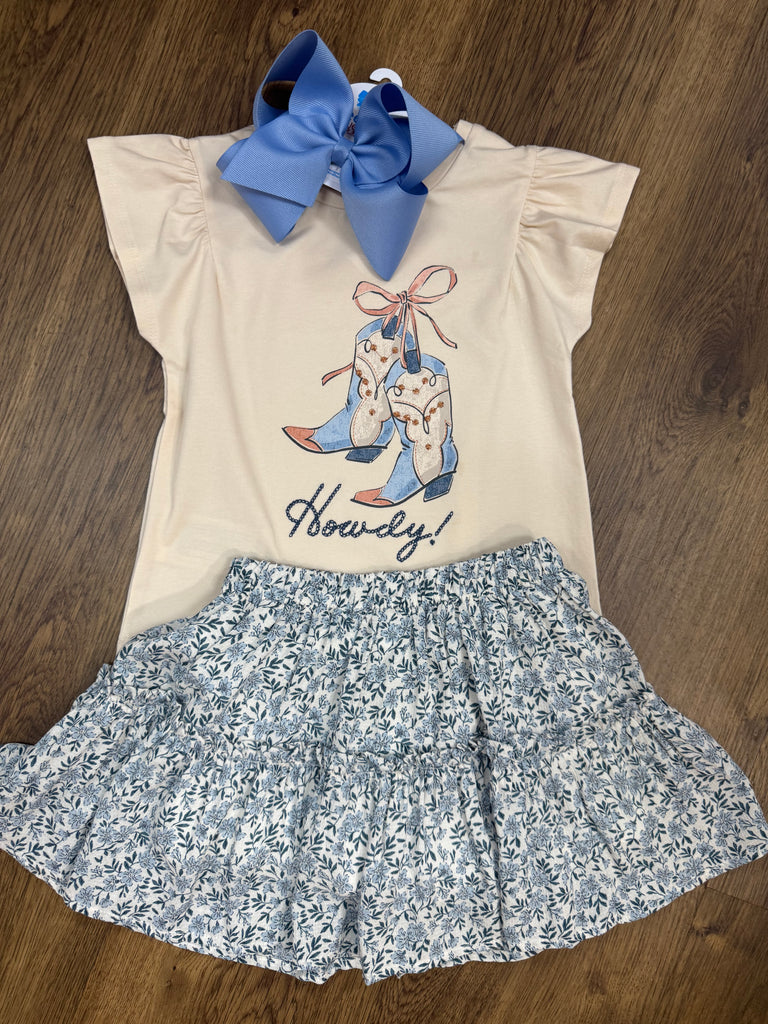 Cap sleeve cream top with blue cowboy boots tied together with a bow with flowy blue chiffon skirt set.