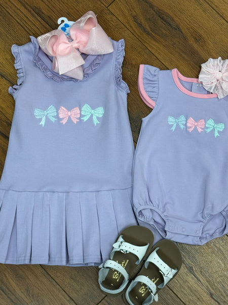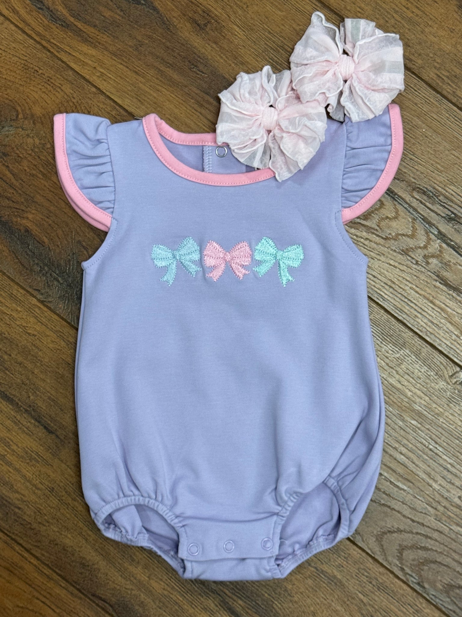 Beautiful lavender bubble with cap sleeve, 3 embroidered bows, with the sleeves and neckline trimmed in pink.