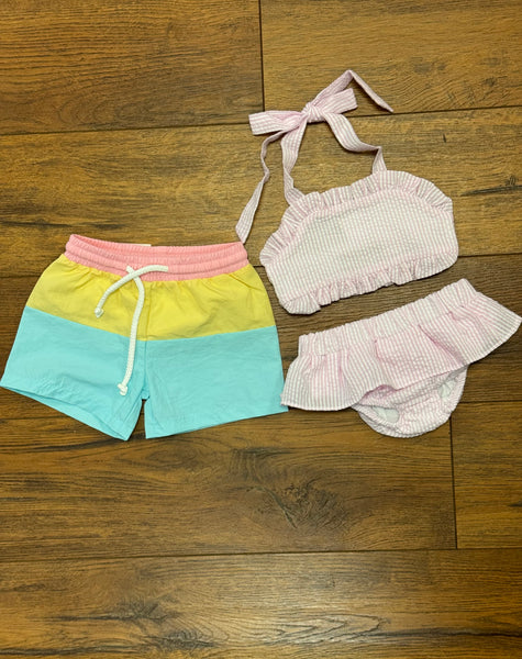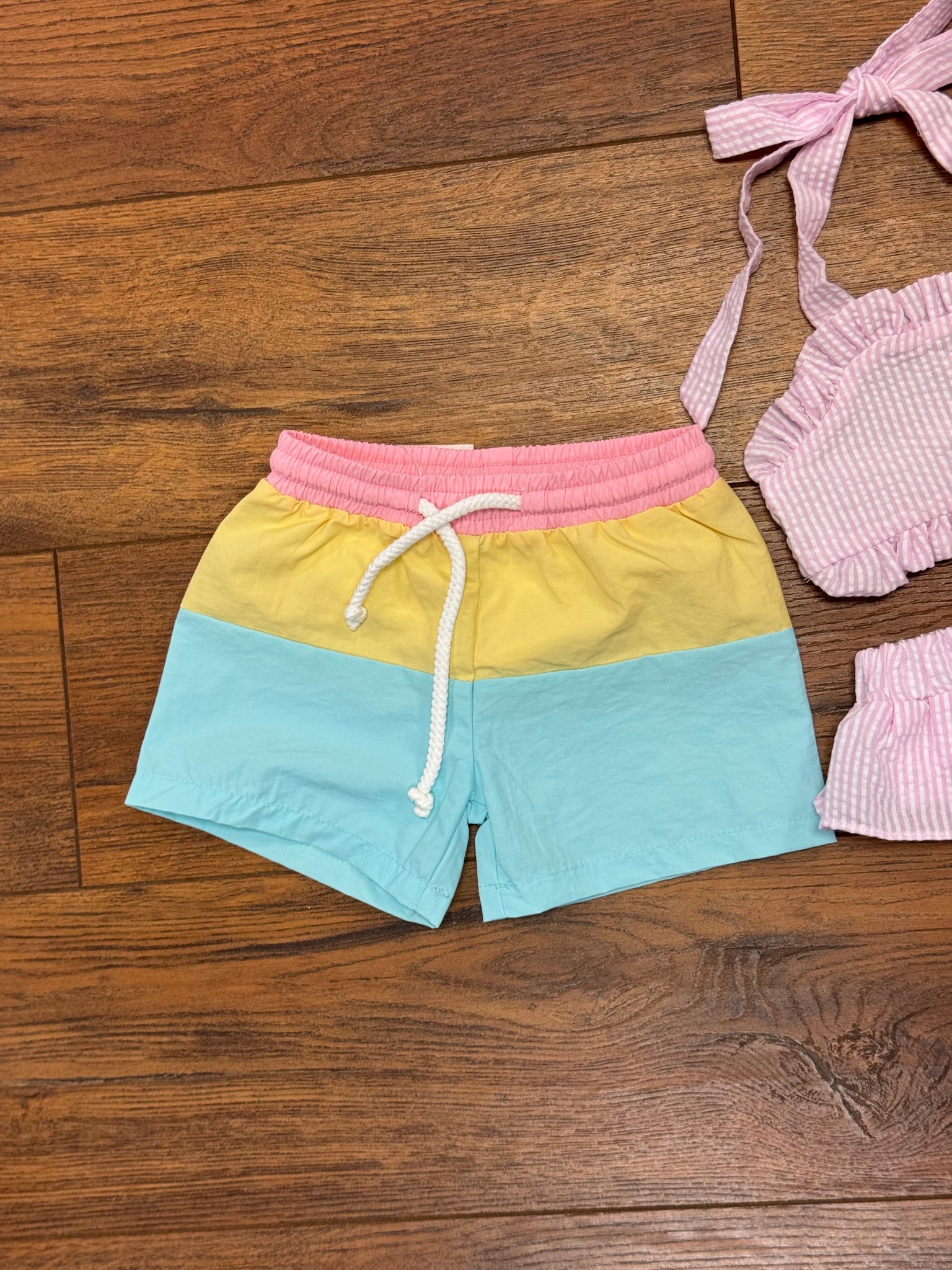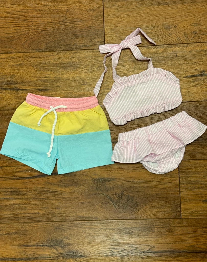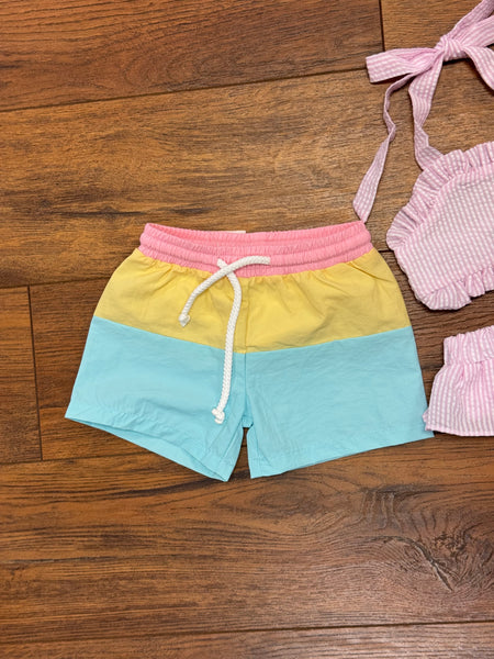 Color block swim trunks in aqua, yellow and coral with elastic waist and tie string.
