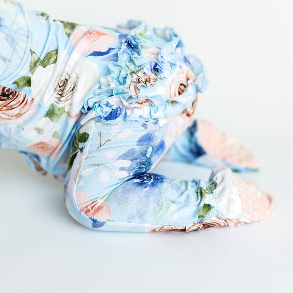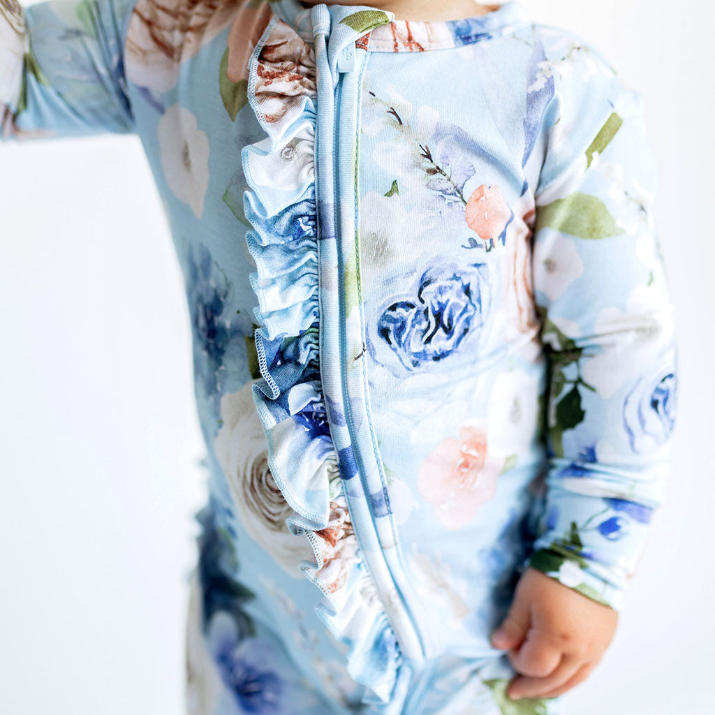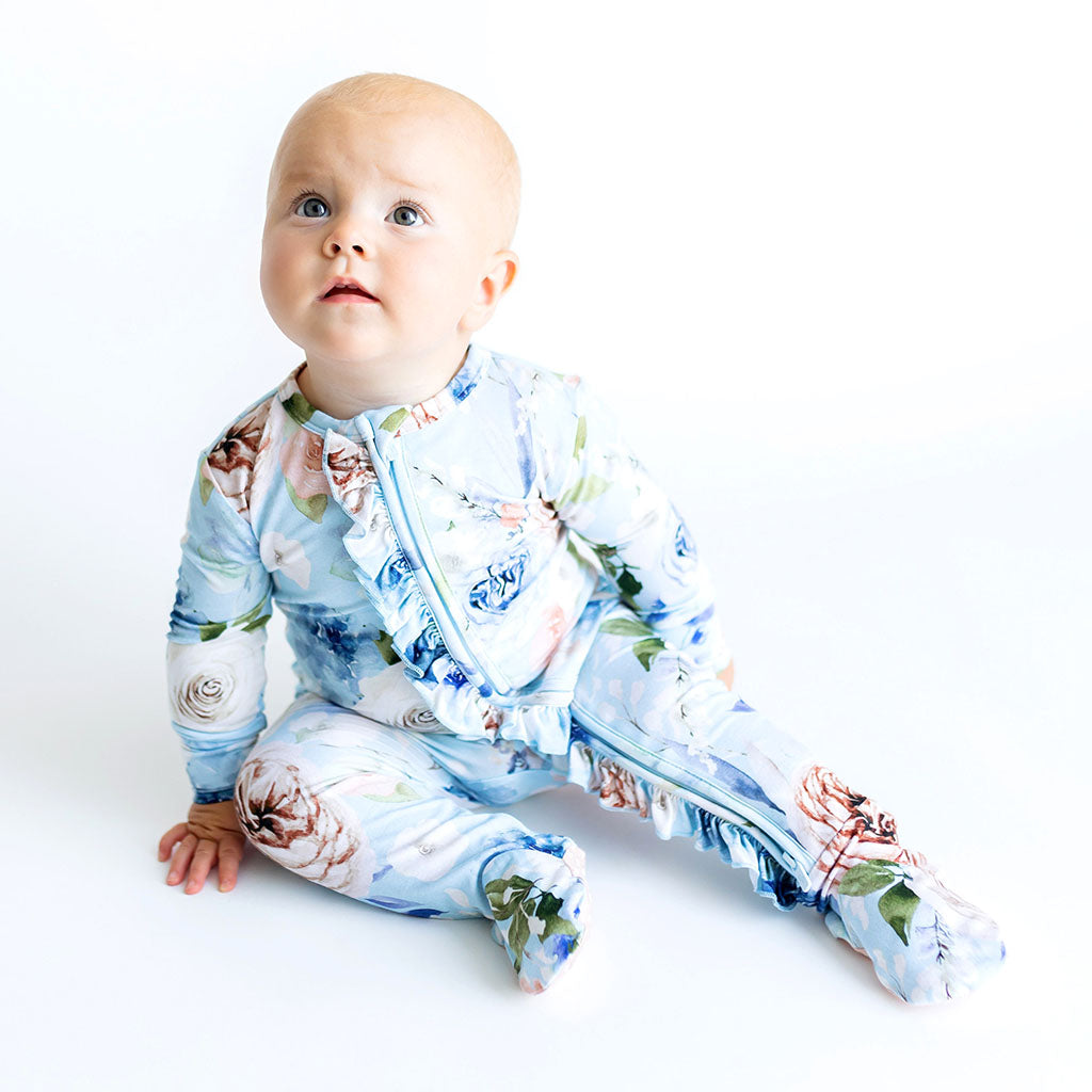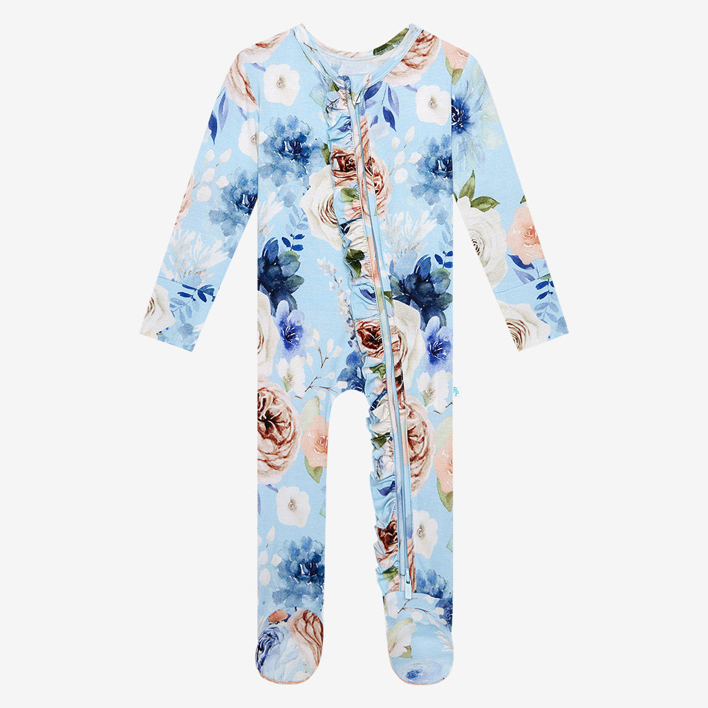 Reimagine your essentials in our coveted girls ruffled footie reversible zippered one-piece in Päpook® viscose from bamboo. Ultra-soft viscose makes our footies the perfect addition to everyday wear. Ruffle detail on bodice and layers of ruffle on the back for a cute added detail—Posh Peanut® signature non-slip grips on the footie for walkers. The reversible 2-way zipper makes diaper changes quick and easy without undressing your baby down. Elastic backing on footies for a snug fit, built-in fold-over mittens in sizes NB and 0-3M. Jammies so cute you can wear them out!