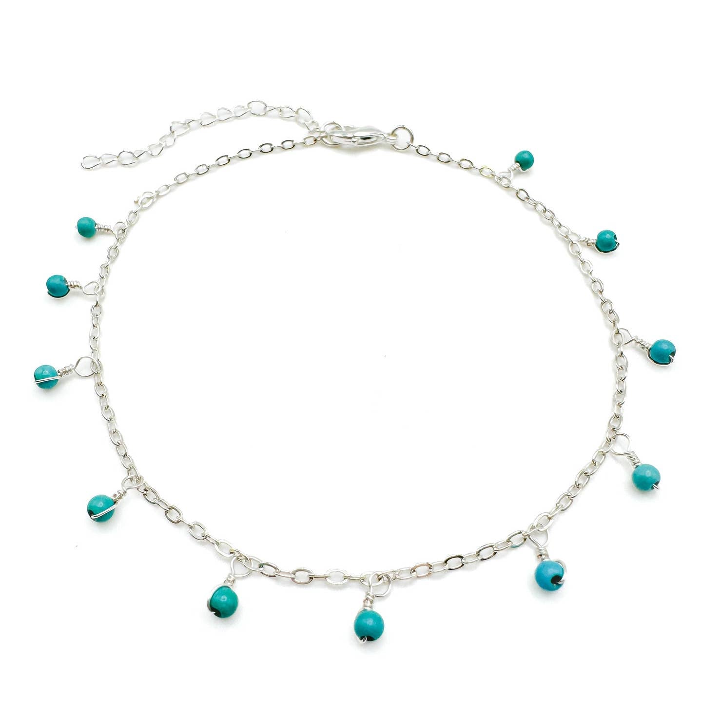 Turquoise beads dangle playfully from a silver plated chain, giving all the beach vibes to your summer looks. Fits a 9 1/2-11 1/2 inch ankle with a lobster clasp and 2 inch extender.