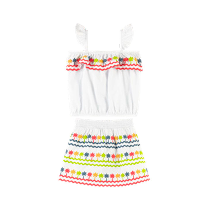 The super cute skort at top have a puffy bright colored palm tree and ric rac print. The top has elastic at the waist but it is more for looks as it is loose fitting.